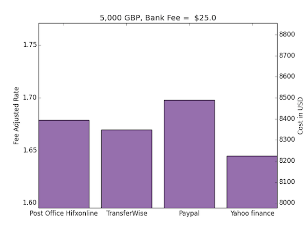 Ok, at this level PayPal no longer becomes a good deal. Both of the algorithms that set quotes for the PostOffice and TransferWise offer a better deal when you’re buying in bulk, whereas PayPal’s price is fixed regardless of quantity. At this level the bank fee becomes less significant a cost (assuming it is not dependent on quantity). Using either of the brokers would save you around $120 compared to PayPal and there’s not really much difference between them.